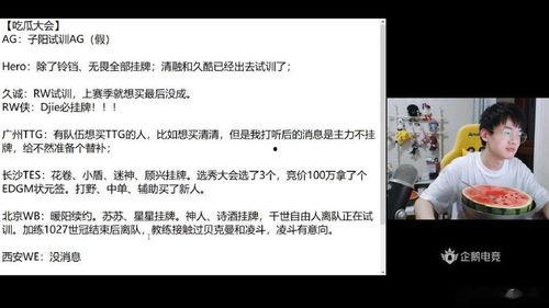 你知道吗,瓶子的这个吃瓜直播其实是有来头的。原来,瓶子在电竞圈里可是个消息灵通的人,他不仅自己喜欢研究各种电竞资讯,还喜欢和朋友们分享。这次直播吃瓜,就是他的一次“分享会”。他希望通过这种方式,让更多的粉丝了解电竞圈的故事,感受电竞的魅力。